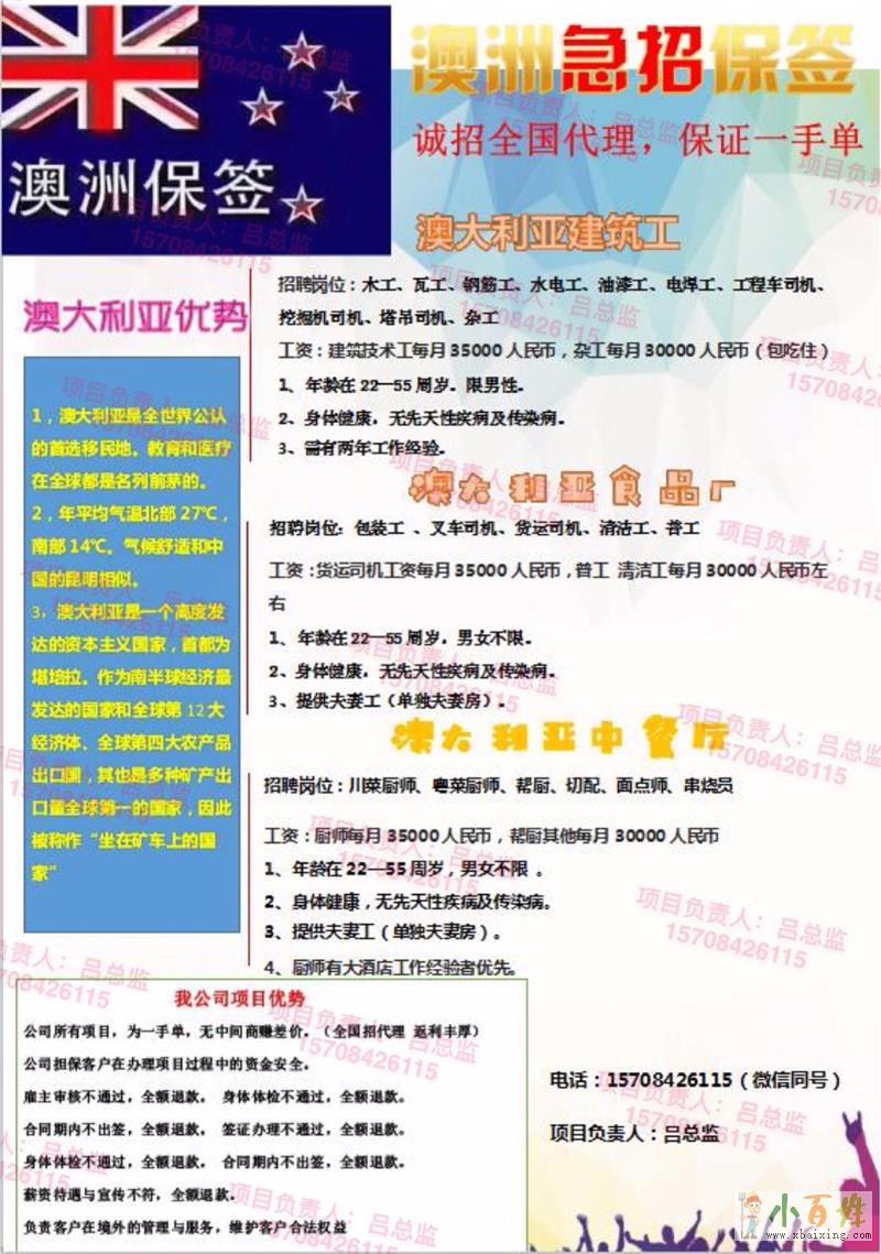 公司宗旨:诚实守信,共创双赢,成功之路,你我同行(本公司各大项目不会英语均可)招聘项目:澳大利亚、新西兰、丹麦、英国、以色列、比利时、日本、挪威、瑞典、加拿大、德国、瑞士建筑工:木工、瓦工、钢筋工、油...